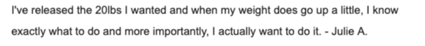 When you usually say, I need a break, itâs too hard or whatâs the point?, you will use a framework to move yourself from resistance into willingness. Instead of being driven by doubt youâll ever get there, youâll tap into commitment. Instead of fearing you wonât keep the weight off, youâll double down on seeing your progress rather than the number on the scale. Say goodbye to guilt about overeating the night before and hello to curiosity, compassion and resilience.